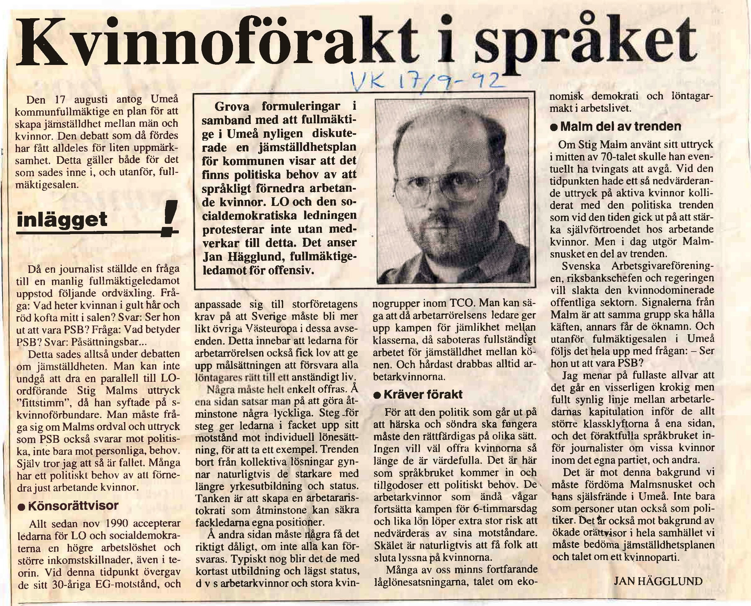Som alla kan se av det handskrivna på kopian av debattartikeln nedan publicerades denna 17 september 1992. Debattartikeln speglar stämningsläget som det var på den tiden rätt bra.