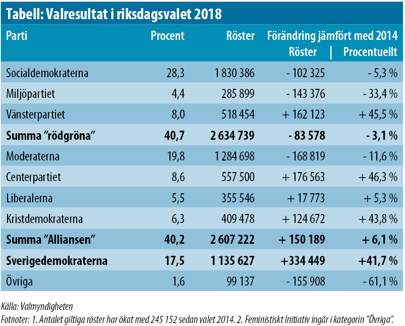 Socialdemokraterna gjorde inte bara sitt sämsta val sedan den allmänna rösträtten för män och kvinnor infördes – S gjorde sitt sämsta val sedan svenskarna fick börja rösta på partier år 1911! Då, för 107 år sedan, fick Socialdemokraterna 28,5 procent av rösterna. I årets val landade de på 28,3 procent. Tillbakagången för S följer samma trend som vi kunnat bevittna hos en rad andra socialdemokratiska partier runt om i Europa. Det parti som backade mest i valet var dock S regeringspartner Miljöpartiet, som förlorade en tredjedel av sina väljare sedan valet 2014. I 20 av 29 riksdagsvalkretsar hade partiet under fyra procent. I slutänden var det storstadsväljarna som räddade MP kvar i riksdagen. Även Moderaterna var större förlorare än S. M tappade fler väljare än S både sett till antalet och procentuellt. Var tionde väljare som röstade på M i förra valet har lämnat partiet.