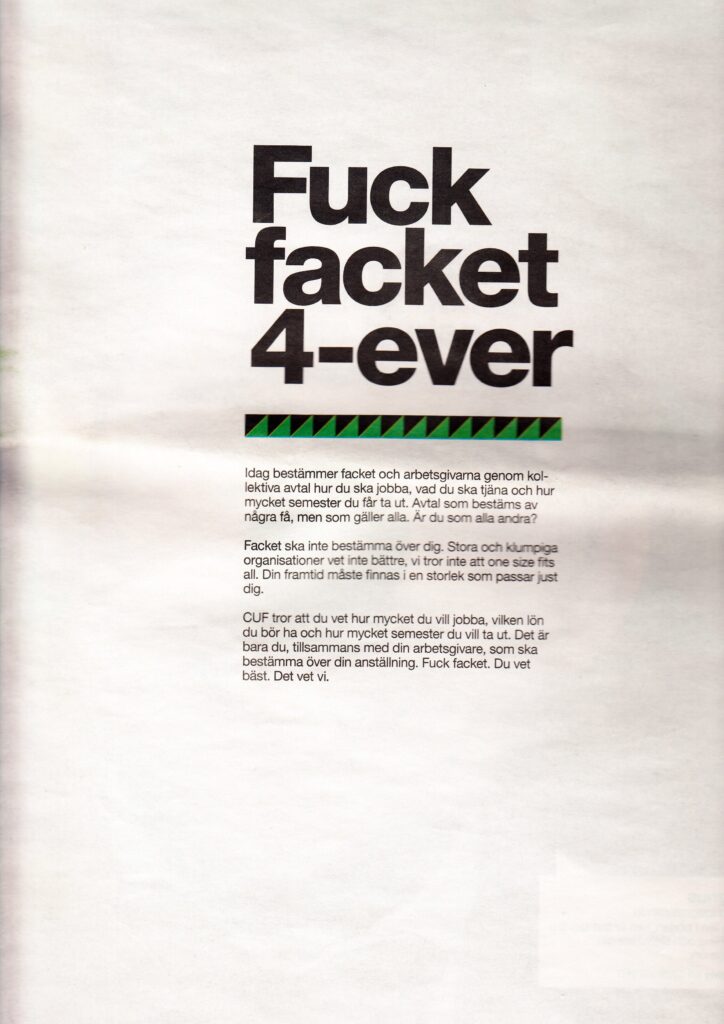 Om detta inte vore nog så förklarade Cuf krig mot facket i en särskilt osmaklig kampanj inför valet 2010. Med rubriken ”Arbetsmarknaden är ett jävla skämt” och slagordet ”Fuck facket 4-ever” angrep Cuf kollektivavtal, fackliga rättigheter och arbetsrättsliga lagar. Iklädda clownnäsor.