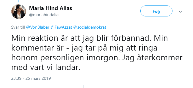 Maria Hind Alias, ordförande för den nystartade ”S-föreningen för jämställdhet emot hedersförtryck / våldsbejakande extremism” – syftandes på en S-ledamot som angrep Arbetarpartiets Jan Hägglund för att vara ”islamofobisk”: