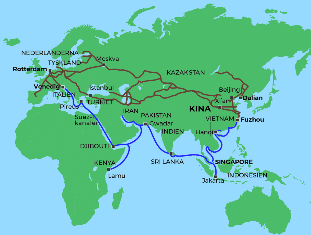 Hur många länder omfattar då detta samarbete? På pappret är hela 139 länder delaktiga i Kinas nya sidenväg. Men i helt olika utsträckning. De två handelsvägarna kommer att öka marknaden för den kinesiska produktionen. Rent ekonomiskt kommer handelsvägarna till Europa att betyda mest – på kort sikt. Efter USA utgör EU-länderna nämligen Kinas största exportmarknad. Men genom att bidra till ekonomisk utveckling i en rad länder med stor, eller mycket stor, befolkning bidrar Kina till att skapa väldiga framtida exportmarknader. Låt oss påminna om att den största satsningen kommer att ske i Pakistan med över 220 miljoner invånare. I Afrika ingår länder som Nigeria, Etiopien, Egypten, Kongo, Tanzania och Kenya, som tillsammans har en befolkning på över 600 miljoner. Men till saken hör att alla länder i Afrika är mer eller mindre delaktiga i den nya sidenvägen.