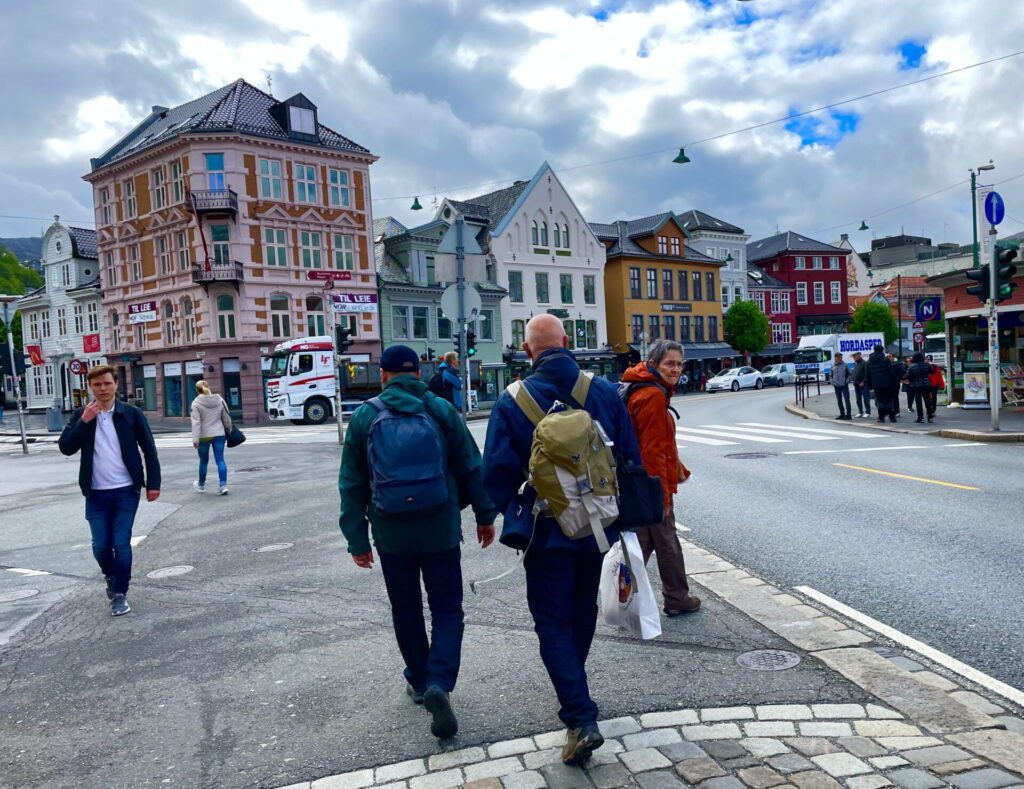 Tre flyg och framme i Bergen, Norges näst största stad, mitt emellan de sju bergen. I största välmening hade vänner noga upplyst oss om att Bergen är den stad i Norge där regnmängden är allra störst. Så vi klev av flygbussen, stod där med ryggsäckar, regnrockar, paraplyer. Beskådade hamnen, båtarna, gladmålade trähus, hela häckar av blommande rhododendron, dramatiska molnformationer på himlen och så solskenet! Den staden gav mersmak.