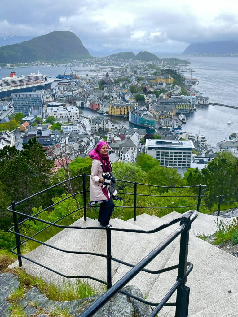 Det regnar och är småkallt när fartyget på morgonsidan når Ålesund, som visar sig bestå av flera olika öar. Jag vill upp på berget och utkiksplatsen fortast möjligt och väninnan väljer att avstå från de 418 trappstegen. Så med varma kläder och precis som i sångtexten ”Hon hade handskar, hatt och sjal och paraply” antar jag utmaningen att besegra berget Aksla.