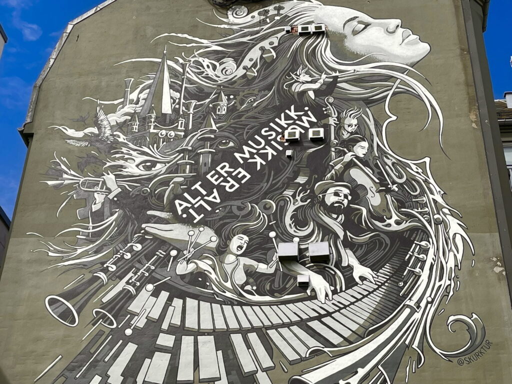 Sjöresan avslutas för vår del i Trondheim. Hamnen ligger inom gångavstånd från centrum och där börjar vi leta efter turistbyrån. Följer kartan på mobilen utan framgång. Frågar oss fram, ingen känner till den. Till slut rätt gata, rätt husnummer och istället ett bibliotek. Där får vi så småningom höra att turistbyrån numera bara är digital. Men på väggen utanför finner vi belöningen efter irrandet. En jättelik graffitimålning, ett kvinnoansikte i profil med ett musikband och instrument i hårslingorna och texten “Alt er musikk, musikk er alt”.